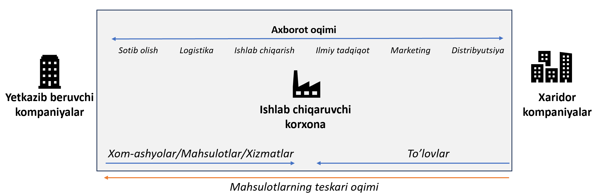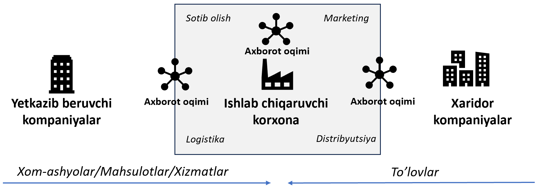 3-chizma funksional bo’limlar o’rtasidagi hamkorlik va korxona miqyosidagi korxona resurslarini rejalashtirish dasturiy ta’minoti orqali ma’lumot almashish bilan bog’langan ichki ta’minot zanjirining vizual tasvirini ko’rsatadi.