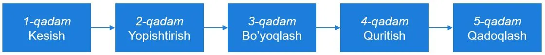 Яна бир мисол, эшик ишлаб чиқариш жараёни 5 та соддалаштирилган қадамдан иборат бўлсин: ёғочни кесиш (1), сўнг тахта бўлакларини ёпиштириш (2), ярим тайёр маҳсулотни бўёқлаш (3), уни қуритиш (4) ва картон коробкага қадоқлаш (5).