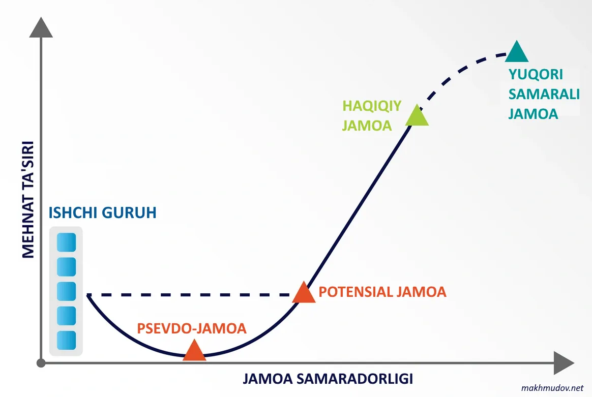 Жон Катзенбах ва Дуглас Смитнинг Жамоа Самарадорлиги Эгри Чизиғи (Katzenbach and Smith’s team performance curve) жамоалар қандай ривожланиб, турли босқичларда қандай ишлаш даражасига эришишини тушунтиради. Бошланғич босқичда, “Ишчи Гуруҳ,” аъзолар асосан ўз индивидуал мақсадларига эътибор қаратади ва жамоанинг умумий ишлаш даражаси паст бўлади. Кейинги босқич, “Псевдо-Жамоа"да баъзи ҳамкорлик уринишлари бўлса-да, улар юзаки ва аниқ мақсадларсиз бўлади, бу эса ишлаш даражасини бироз яхшилайди. “Потенциал Жамоа” босқичида жамоа умумий мақсадлар ва ролларни ривожлантира бошлайди, бу эса иш даражасини сезиларли яхшиланишига олиб келади, лекин ҳали ҳам ўз жараёнларини такомиллаштиришга муҳтож бўлади. “Ҳақиқий Жамоа” босқичида жамоа тўлиқ функционал бўлиб, кучли мажбурият, очиқ мулоқот ва самарали ҳамкорликка эга бўлади, бу эса юқори ишлаш даражасига олиб келади. Ниҳоят, “Юқори Самарали Жамоа” босқичида жамоа чуқур мажбурият ва ишонч билан ишлайди, доимий равишда кутилган натижалардан ошиб кетади ва инқилобий натижаларга эришади. Мисол учун, янги лойиҳани ишлаб чиқиш учун йиғилган гуруҳ аввалига “Ишчи Гуруҳ” сифатида ишлаши мумкин, лекин вақт ўтиши билан улар умумий мақсадни ривожлантиришади, ролларни тақсимлашади ва бир-бирларига ишонч ҳосил қилишади. Ниҳоят, улар “Ҳақиқий Жамоа"га айланиб, лойиҳани муваффақиятли якунлашади ва ташкилот муваффақиятига катта ҳисса қўшишади.